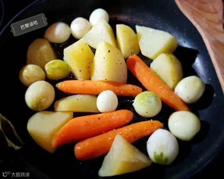 提前准备配菜,通常用洋葱、小胡萝卜、土豆和双孢蘑菇。将配菜提前半小时放入锅内,在红酒汤汁里慢炖,风味浓郁