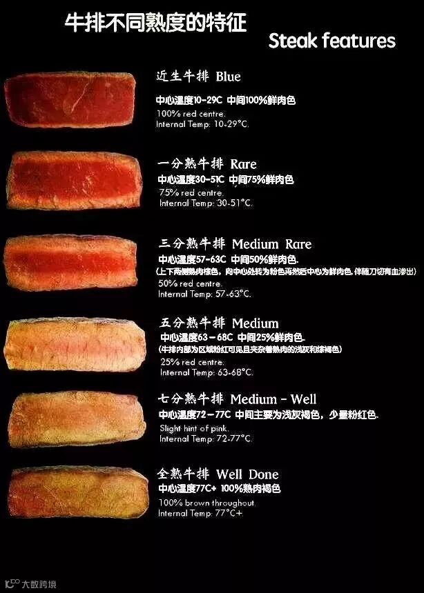 想煎出一块好牛排,要知道最影响牛排味道的重要因素就是——熟度,因为熟度决定了牛排的口感和滋味,所以我们在这里必须要先了解一下牛排的熟度。