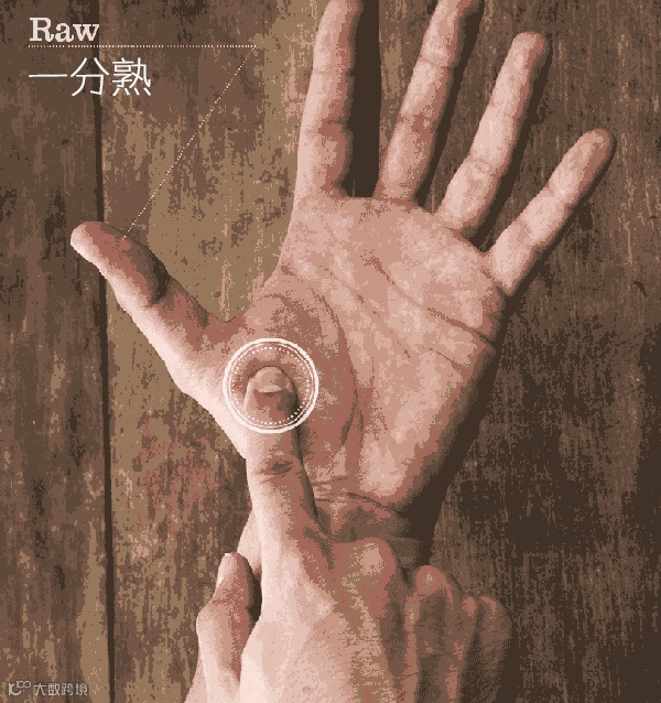自己在家煎牛排的时候,可以通过感受肉的柔软程度和自己手掌根的柔软度做对比,大致判断肉有几分熟。