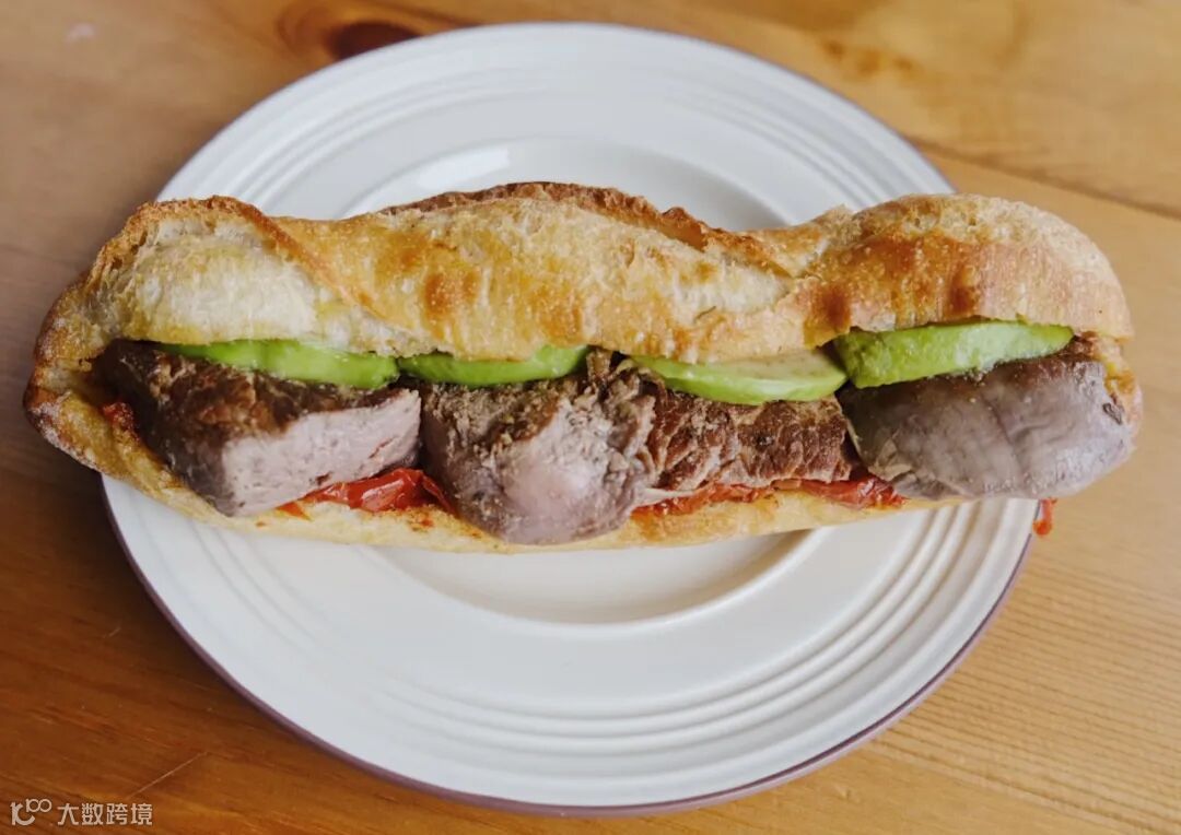 此时再来将牛排切成小块,法棍横着切开(不要切到底),内侧涂满黑胡椒蛋黄酱,再按照培根→干番茄→牛肉块→酸黄瓜→牛油果的顺序夹进去。