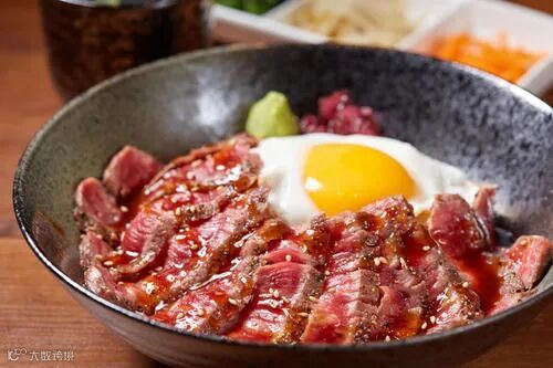 舀一碗白米饭打底,米饭上铺盖一层刚刚做酱汁用的洋葱,再把牛排片码上去,堆成一座「牛排火山」。煎一个5分熟的流心蛋。浇上酱汁~