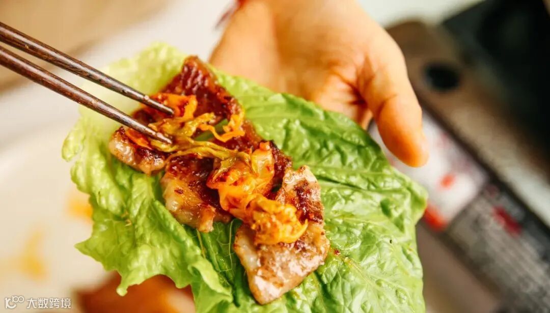 然后……就可以边烤边吃啦!取一片洗净的生菜叶,夹起两块还在流油的牛小排,再铺上泡菜,三两下一裹。