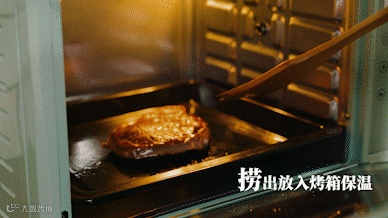 04|做出嫩滑口感牛排的一个小诀窍就是——烤箱!用烤箱保温可以使煎完出锅的牛排热量往中心传递,保持牛排水份,一般放置时间与煎牛排的时间相当。