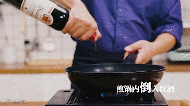 05|在牛排保温期间,开始烹调酱汁。煎锅内倒入红酒和高汤拌匀,煮至锅内汤汁剩余三分之一,放盐,黑胡椒调味,关火,放入黄油铲拌使汤汁浓稠。