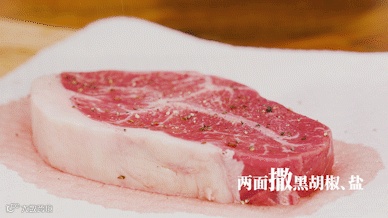 01|牛排放置常温,吸水纸吸取多余血水。在牛排两面撒上适量的黑胡椒、盐,并用手按压,使调料的风味充分地渗入。