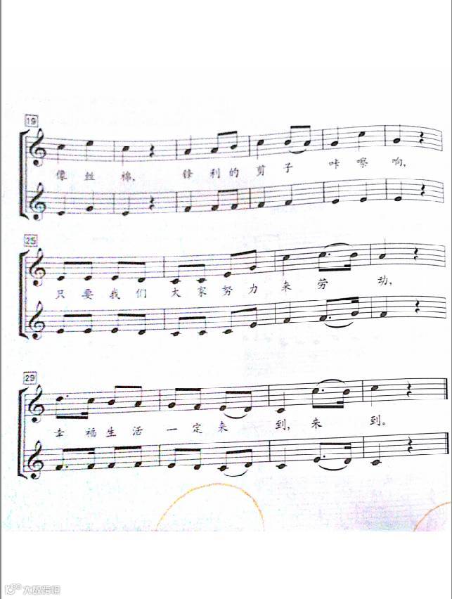 二、二声部练习,剪羊毛唱熟两个声部的歌词,1-16小节弹一声部唱二声部,或者弹二声部唱一声部,继续巩固二声部的概念,掌握边听边唱的技巧。