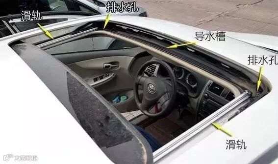 在天窗的四个角落,各设计了一个排水口。因为位置的原因,汽车天窗排水孔容易被树叶、污秽等堵塞,万一堵塞,雨水可以顺着天窗边缘缝隙流到车内,轻则弄湿车顶饰板,重则导致车厢内全面积水。