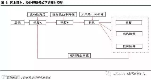 同业理财大致模式是A银行(大行为主)购买B 银行(中小银行为主)的同业理财,或者是银行将自营资金投资于货币基金,然后货币基金再配置于同业存单,最后同业存单投资于同业理财。理财成本仍高,而资产收益率下降,部分资产管理能力不强的中小银行开始大量委外。非银机构拿到委外资金后,通过加杠杆、加久期、加风险等途径增加收益率。