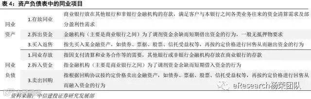 银行同业业务是指商业银行之间以及与其他金融中介之间的资金融通业务。由于同业业务低资金成本、低资本消耗的特点,激励银行将企业项目风险转化为同业业务风险,因此形成了巨大规模的同业资产。中国的银行同业业务主要体现于资产负债表中的两大项,即同业资产与同业负债。其中同业资产下有存放同业,拆出资金,买入返售三项。同业负债下有同业存放,拆入资金,卖出回购三项。