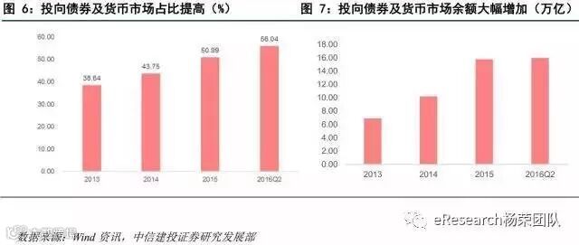 2015年央行多次降息,银行流动性充足而资产匮乏,因此同业理财快速发展。根据中债登的统计,2015年同业理财增长近2.5万亿,占理财规模比重从3.57%飙升至12.77%。截至2016年上半年末,银行同业类理财规模超4万亿元,比去年末增加约1万亿元,占比达15.3%,比去年末提高1.53%。