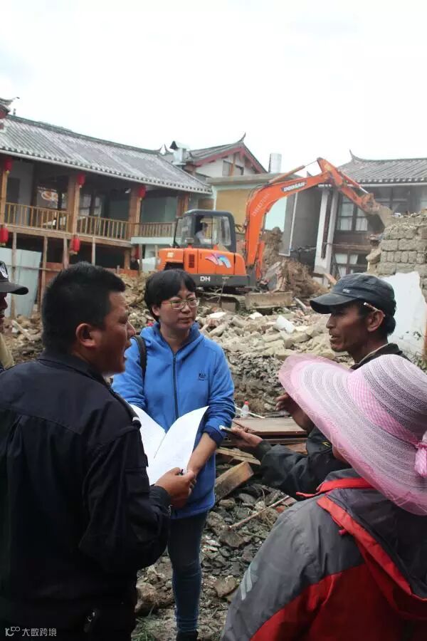9月11日上午,丽江束河古镇,白丽刚雇来挖掘机和卡车,拆除他家宅基地上的客栈时,与前来阻止的客栈老板阿玲发生冲突。