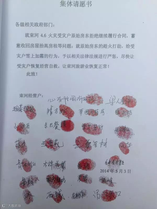 记者拿到一份请愿书,上面有223个手印和签名,都是在丽江束河古镇承租经营的客栈老板,他们希望政府重视房东毁约事件,能够介入处理。