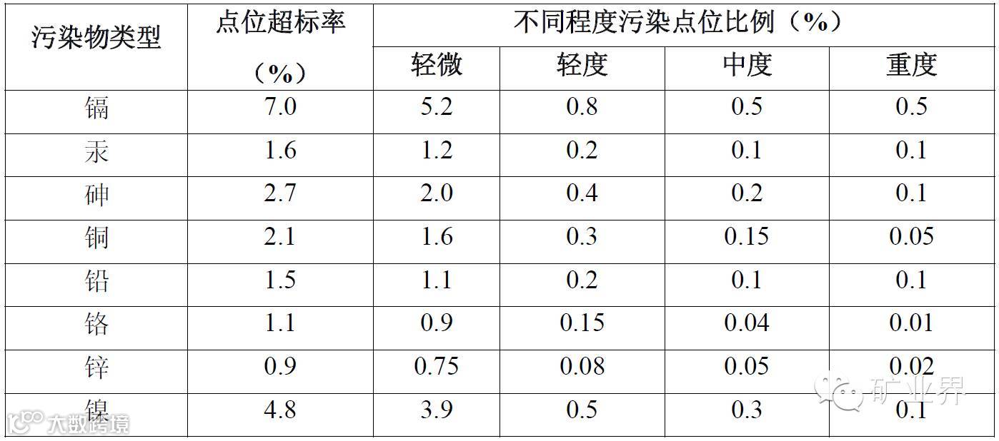 “在调查的70个矿区的1672个土壤点位中,超标点位占33.4%,主要污染物为镉、铅、砷和多环芳烃。有色金属矿区周边土壤镉、砷、铅等污染较为严重。”