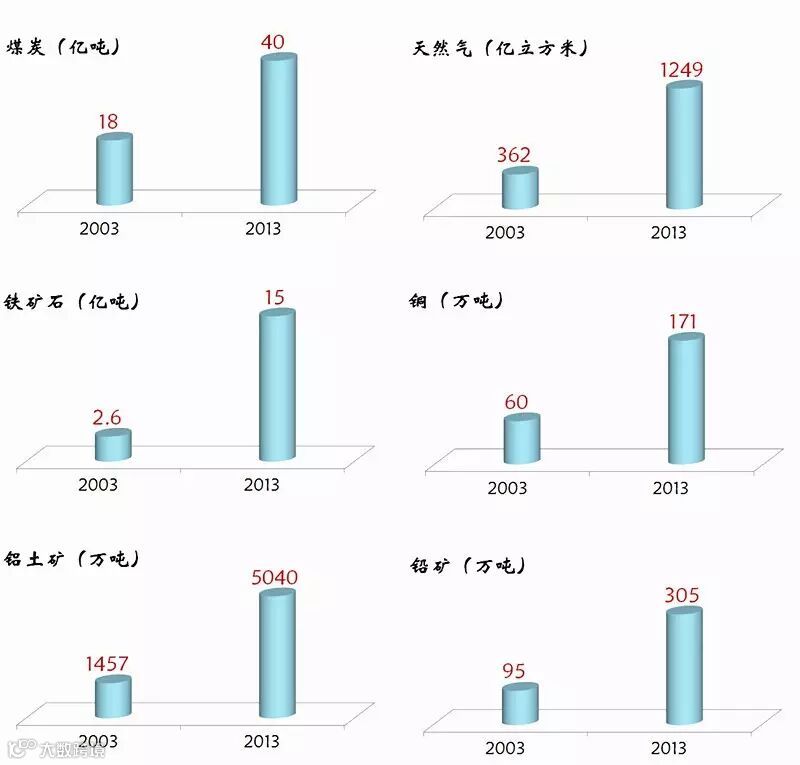 2003--2013年10年间,中国矿产资源产量直线增长。煤炭产量从18亿吨上升到了40亿吨,天然气产量从362亿立方米上升到了1249亿立方米,铁矿石从2.6亿吨增长到了15亿吨,铜矿从60万吨增长到171万吨,铝土矿从1457万吨增长到5040万吨,铅矿从95万吨增长到了305万吨,锌矿从203万吨增长到539万吨。漫山遍野的找矿、满山遍野的开矿,10年间,中国矿业产值规模扩大到了原来的5倍。