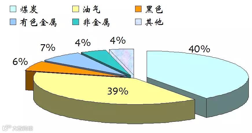 再让我们从中国矿业产值构成来分析中国矿业发展的资源条件。我国煤炭产值占40%,油气资源开发占39%,铁矿等黑色金属产业占6%,有色金属占7%,非金属行业占4%,其他矿业产业占比不足4%。