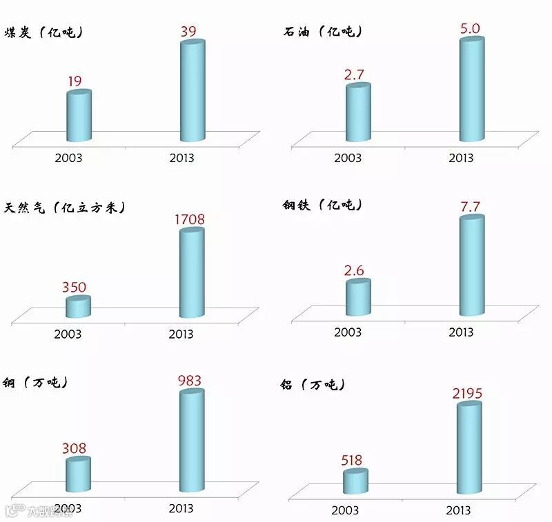经济高速发展带动了矿产资源的大量消耗。2003年至2013年,中国煤炭消费量从19亿吨增长到了39亿吨,石油消费量从2.7亿吨增长到了5.0亿吨,天然气消费量从350亿立方米增长到了1708亿立方米,钢铁消费量从2.6亿吨增长到了7.7亿吨,铜消费量从308万吨增长到了983万吨,铝消费量从518万吨增长到了2195万吨。一眨眼的功夫,中国经济取得了举世瞩目的成就,矿产资源消费量连续翻番,十年高歌,恍如一梦!