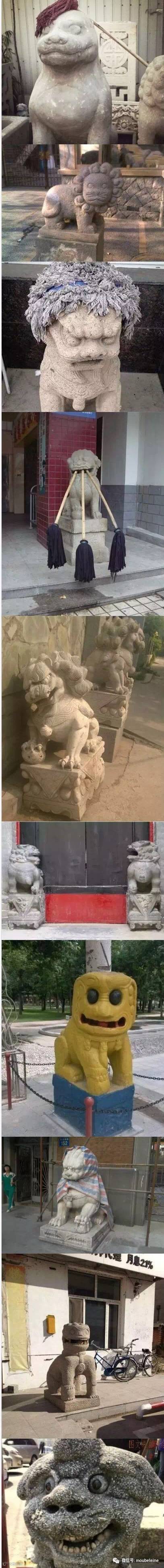 不知从何时起,狮子就成为了看守门户的吉祥物了,并且逐渐和中国文化相融合。石狮不仅有不同的时代特点,还有明显的地域特色。总体上,北方的石狮子外观大气,雕琢质朴;南方的石狮更为灵气,造型活泼,雕饰繁多,小狮子也不仅在母狮手掌下,有的爬上狮背,活泼可爱。然而近期出现的各种石狮子真是刷爆了微博。