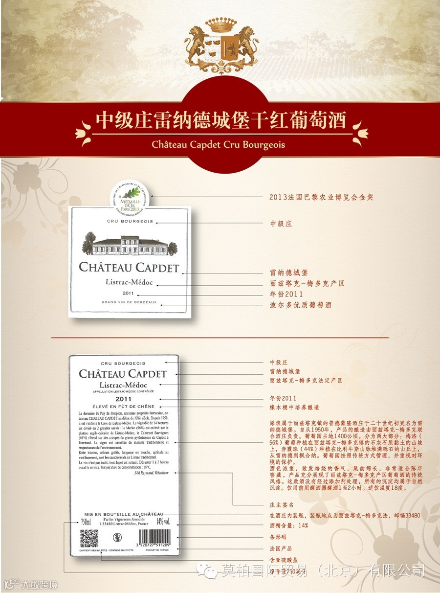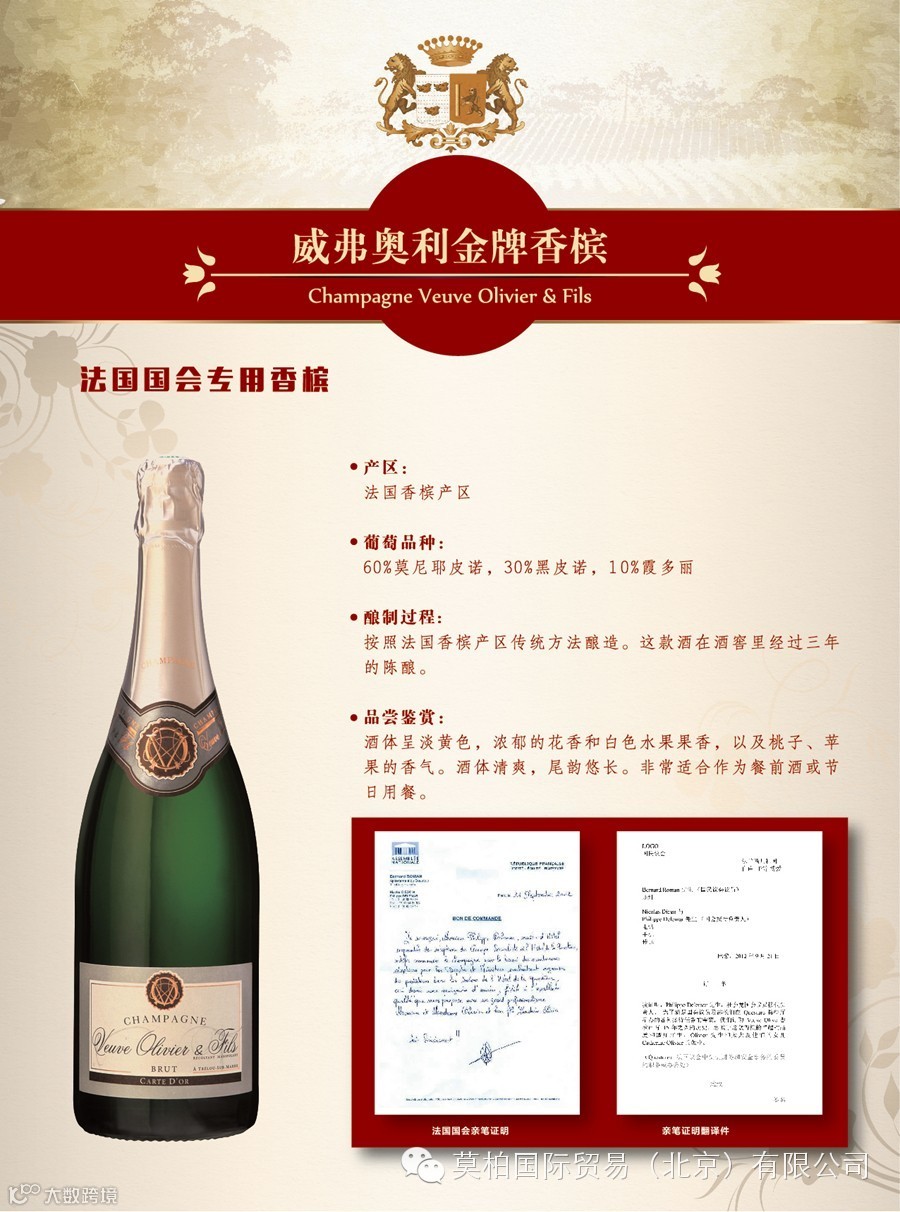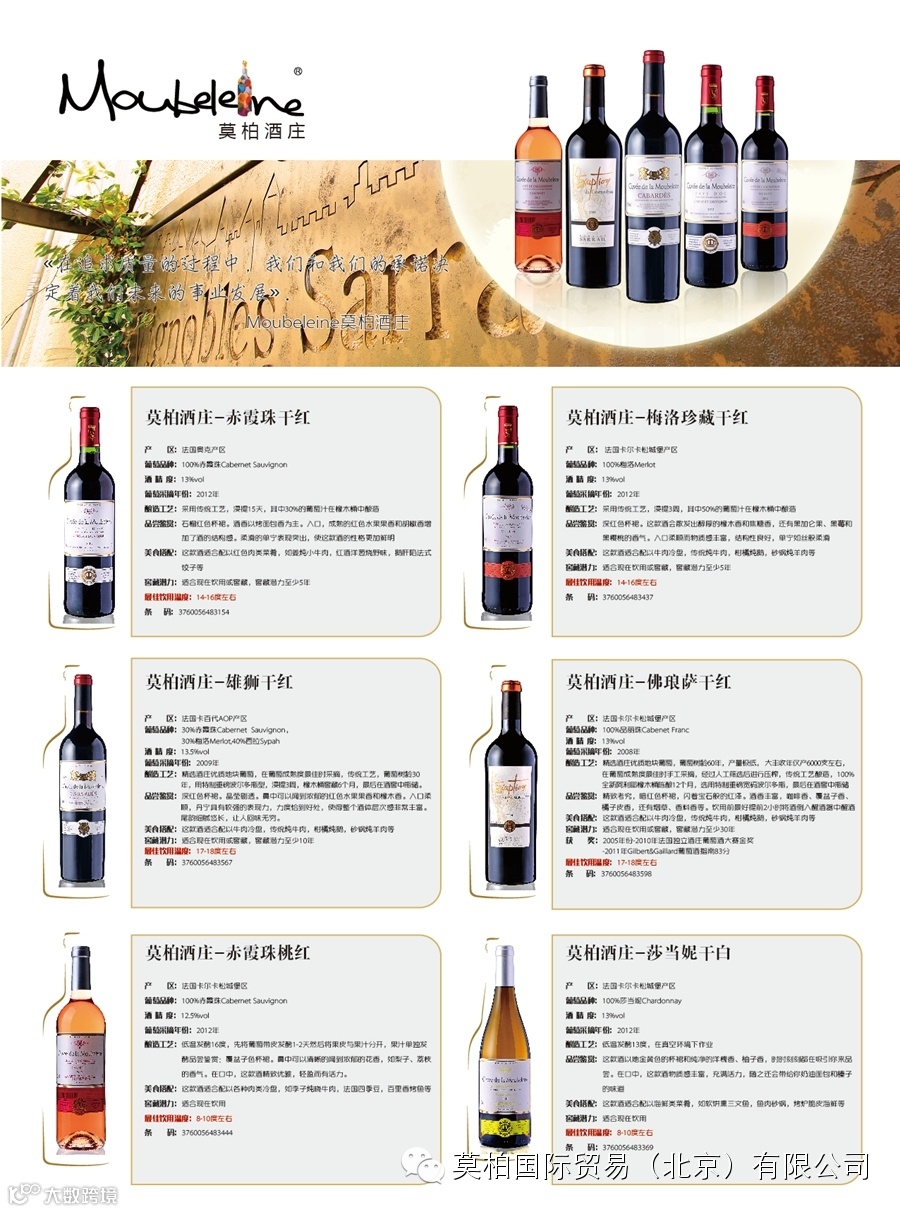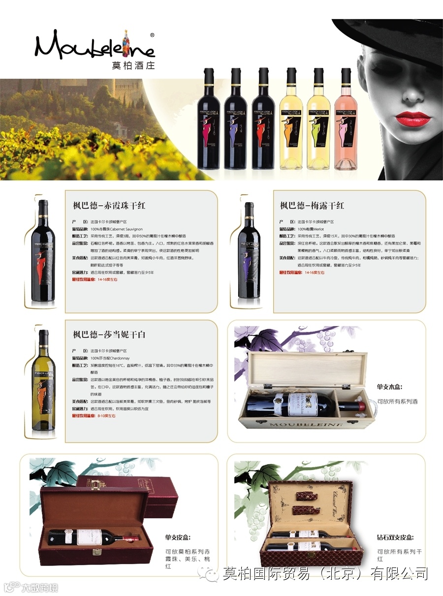 莫柏国际贸易(北京)有限公司是一家总部位于北京,面向全国招商~原瓶酒庄酒的进口商。我们是法国莫柏酒庄(波尔多-布尔丘产区)的种植商也是进口商!同时独家代理圣爱美隆-列级庄、波美侯、拉朗德波美侯、勃艮第马贡-普伊富赛产区等酒庄!