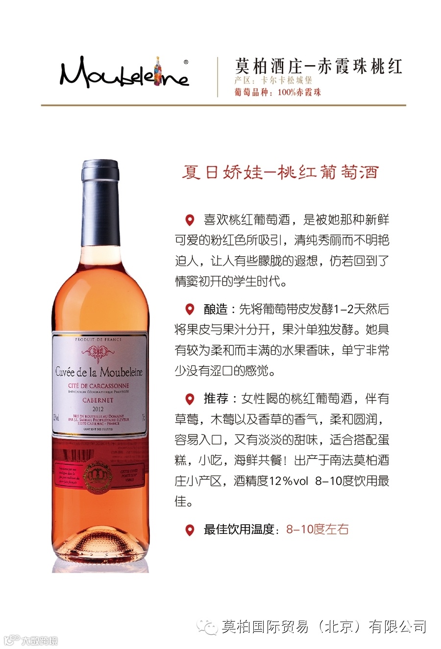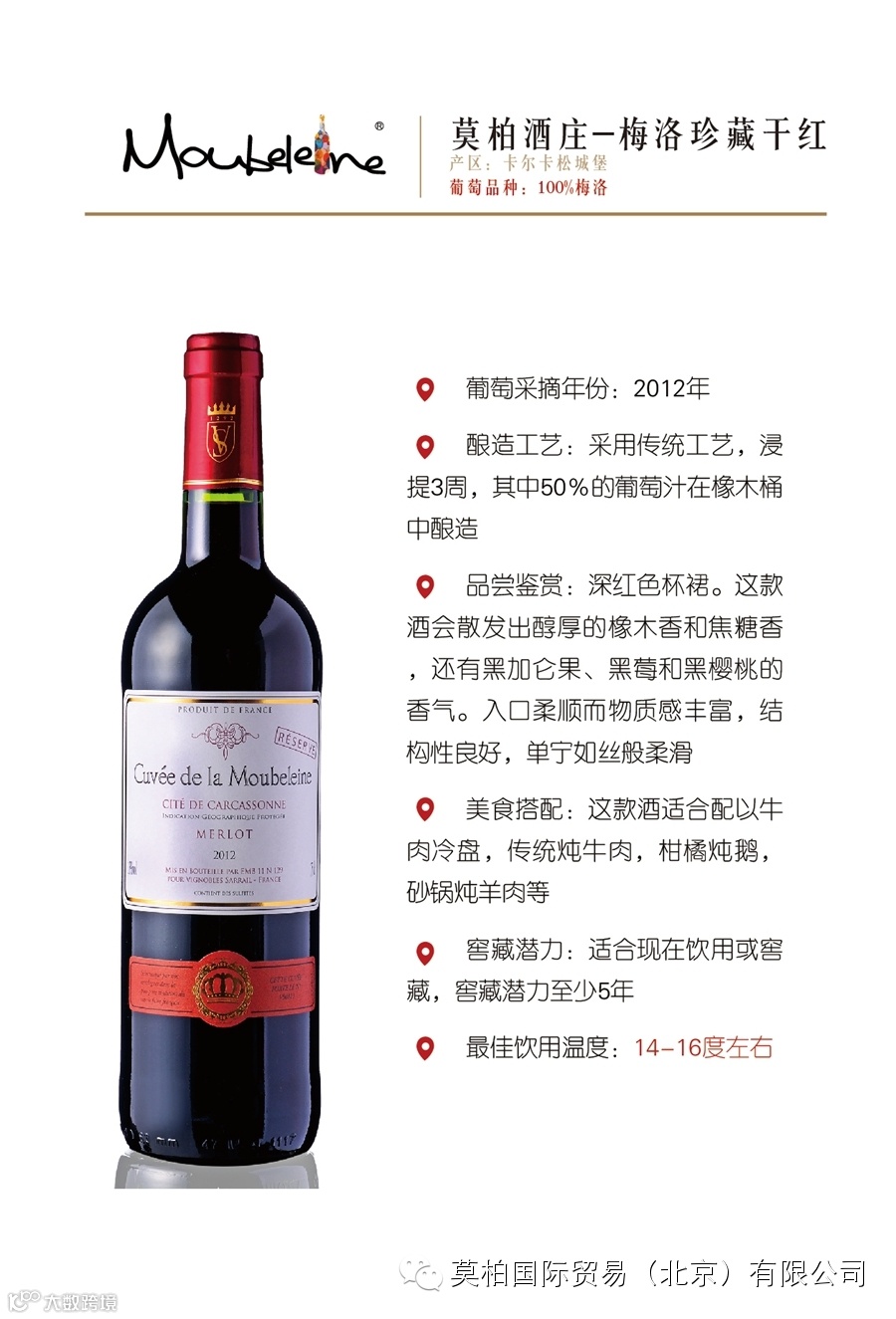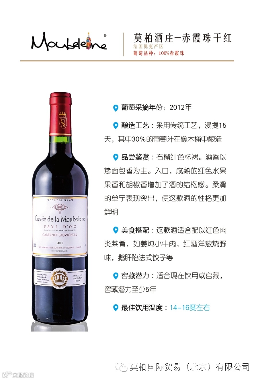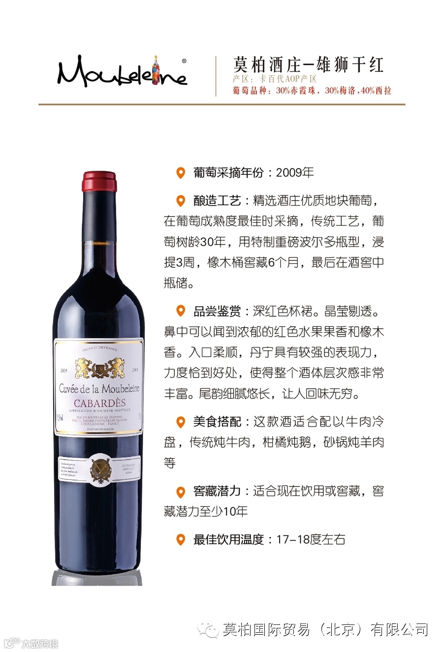 莫柏国际贸易(北京)有限公司是一家总部位于北京,面向全国招商~原瓶酒庄酒的进口商。我们是法国莫柏酒庄(波尔多-布尔丘产区)的种植商也是进口商!同时独家代理圣爱美隆-列级庄、波美侯、拉朗德波美侯、勃艮第马贡-普伊富赛产区等酒庄!