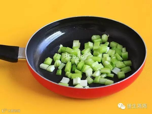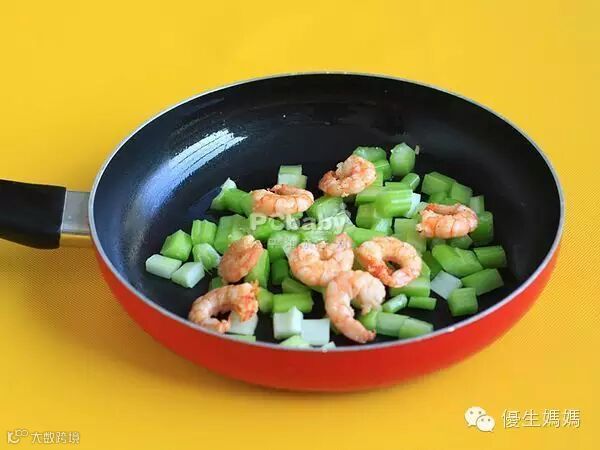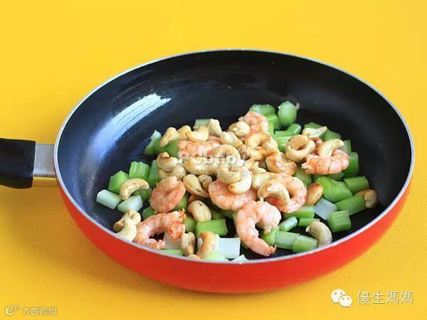 步骤5:锅加热,再倒少许油,油热得将要冒烟后,将西芹段放入翻炒,然后倒入虾仁翻炒并加盐和鸡粉调味。将腰果放入略微翻炒即可出锅。