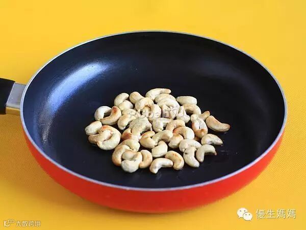 步骤1:如果是生腰果,要先烧热锅,倒一点油,用小火慢慢地不断翻炒,将腰果炒熟炒香。而熟腰果就可省略这一步。