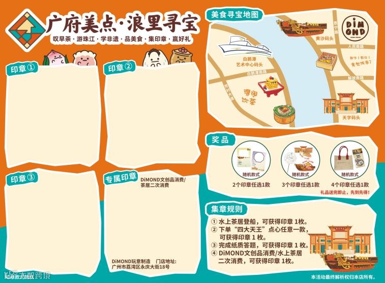 地点:广州好水上茶居天字码头、黄沙码头、白鹅潭艺术中心码头、永庆坊 DIMOND 店。