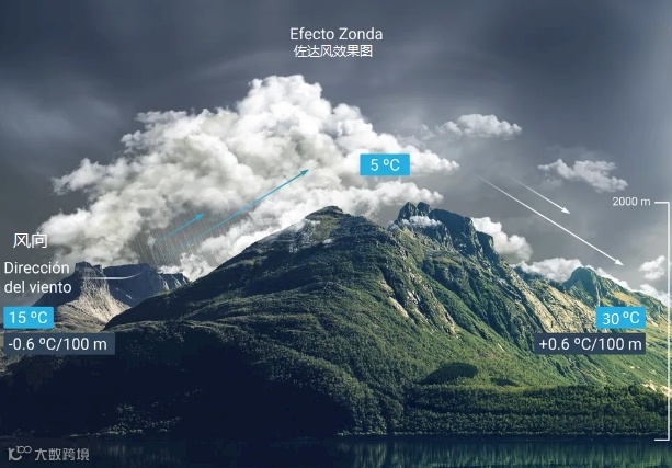 它们也被称为佐达风(viento Zonda)。从技术上讲,佐达风是一种焚风,即一种干燥的下坡风,发生在山脉的背风(下风)一侧。“Zonda”是一个地区术语,用于描述这种风,因为它发生在阿根廷西部的安第斯山脉斜坡上,包括门多萨、拉里奥哈和圣胡安的葡萄酒产区。在这些地区,风特别凶猛,因为它必须爬过山脉的高海拔(然后呼啸而下)。
