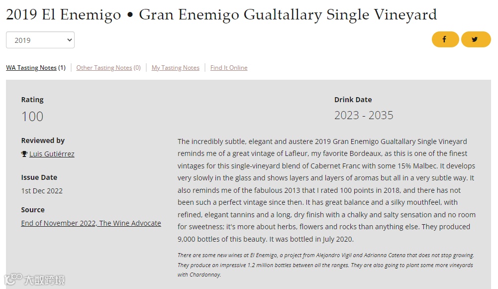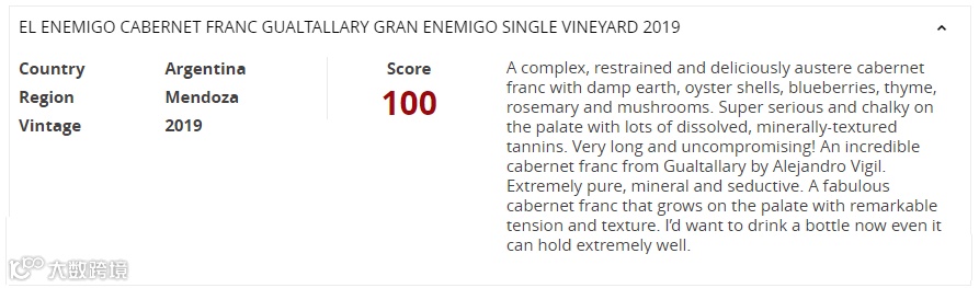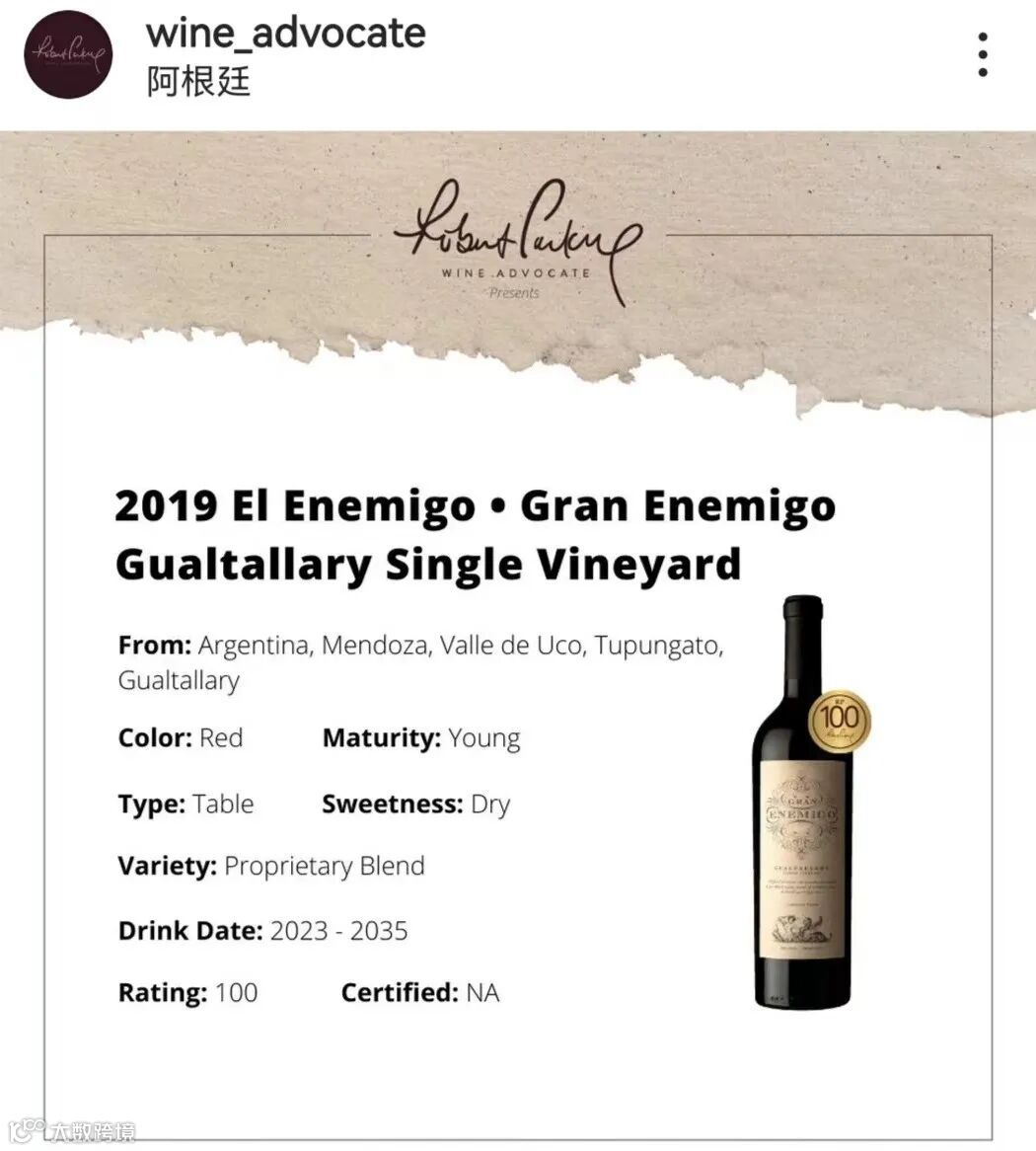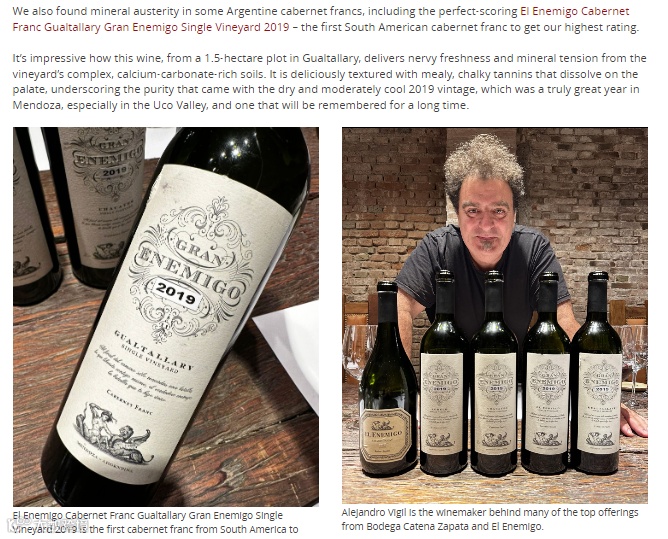 Alejandro Vigil是Catena Zapata的首席酿酒师,被评为Decanter 2021"南美五大潮流引领者之一",也是Tim Atkin“2019年度酿酒师”以及The Drinks Business“全球百大醉佳酿酒师之一”。他亲手打造的款酒也是阿根廷最早的两个获得RP满分的酒款,其中一款就是EL Enemigo品牌下Gran Enemigo Gualtallary Singe Vineyard Cabernet Franc 2013,这也是全球首个获得RP满分的品丽珠。