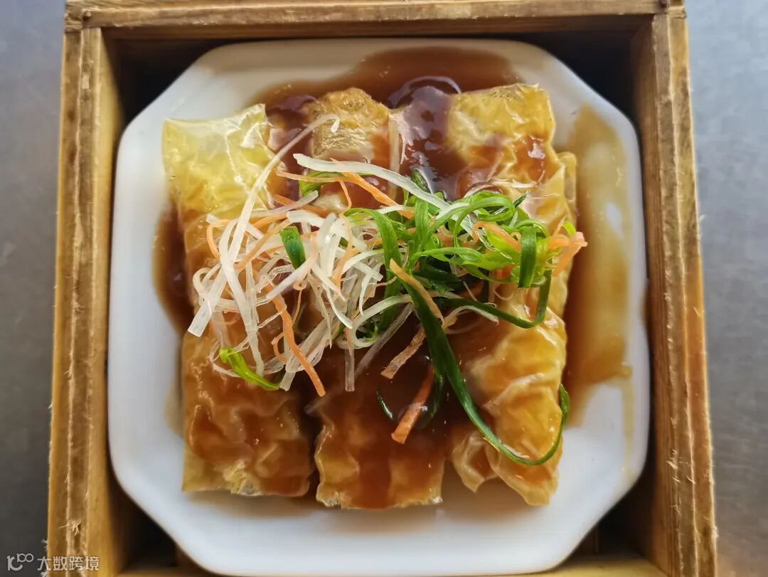 薄如蝉翼,半透可见,鲍汁鲜甜,腐皮韧爽
