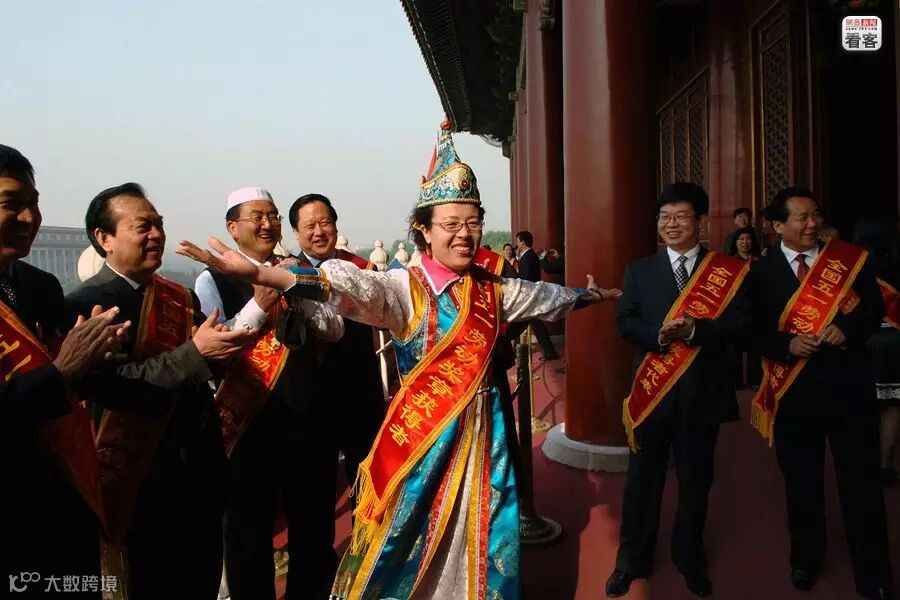 【图为2007年4月28日,一位来自内蒙古的“全国五一劳动奖章”获得者在天安门城楼上起舞。新华社记者何俊昌摄】