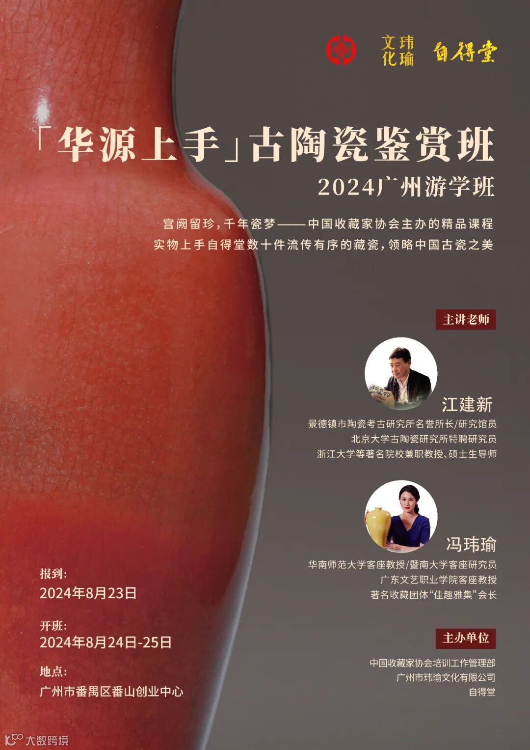中国收藏家协会培训工作管理部与自得堂合作,将于2024年8月23日至25日在广州市举办“华源上手”第2期古陶瓷鉴赏(广州)游学班。