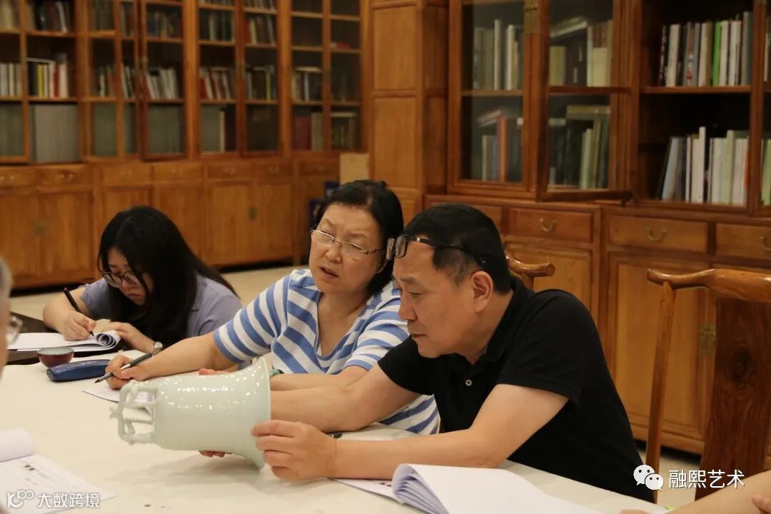 故宫博物院研究馆员冯小琦(左)、深圳考古研究所所长任志录(右)鉴定白釉交龙钮瓷钟