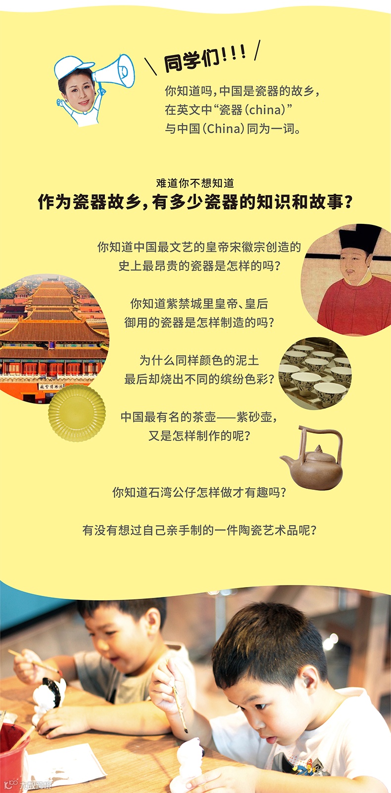 我们每天都请来陶瓷领域的著名专家学者,美术大师,让孩子站在艺术大咖们的肩膀上看世界、读文化、品艺术,释放每一个孩子都潜藏着艺术天赋