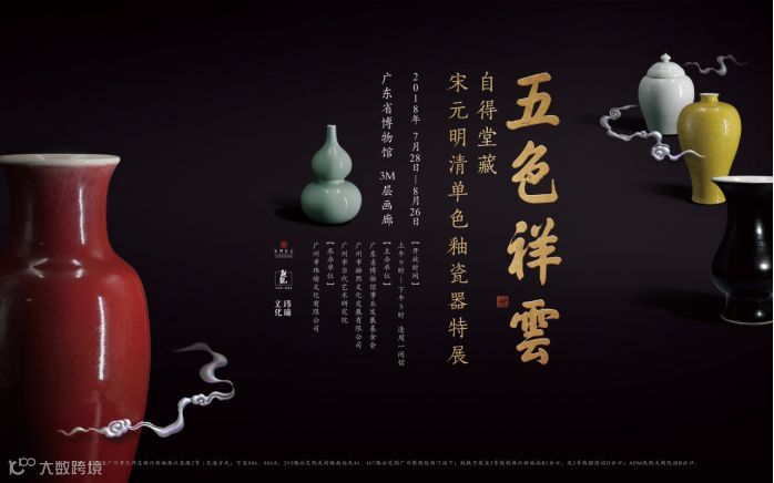 2018年7月28日,由广东省博物馆事业发展基金会、广州市融熙文化发展有限公司、广州市当代艺术研究院共同主办,广州市玮瑜文化有限公司承办的“五色祥云——自得堂藏宋元明清单色釉瓷器特展”将在广东省博物馆3M层画廊隆重开幕。