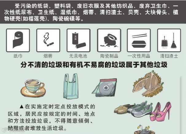其他垃圾,是指除可回收物、有害垃圾、餐厨垃圾以外的混杂、难以分类的生活垃圾,包括废弃卫生巾、一次性纸尿布、餐巾纸、烟蒂、清扫渣土等,要放进灰色垃圾桶。