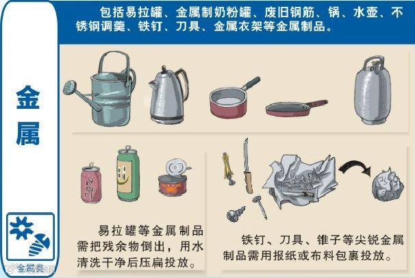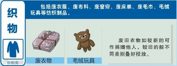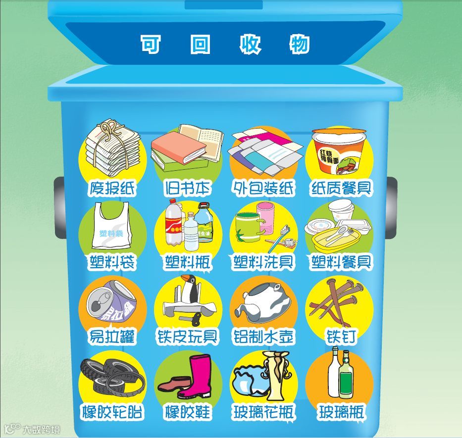 可回收物是指适宜回收和资源利用的生活垃圾,包括纸类、塑料、金属、玻璃、木料和织物等要放进蓝色垃圾桶。