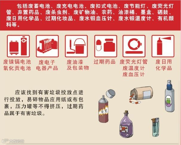 有害垃圾,是指对人体健康或者自然环境造成直接或者潜在危害的生活垃圾,包括废充电电池、废扣式电池、废灯管、弃置药品、废杀虫剂(容器)、废油漆(容器)、废日用化学品、废水银产品等,要放进红色垃圾桶。