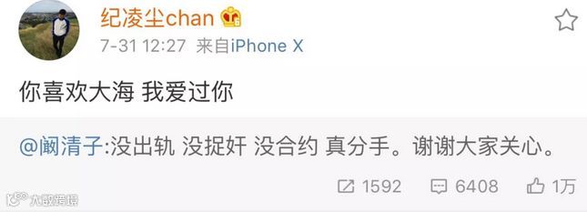 很快,纪凌尘也转发了这条微博,并评论“你喜欢大海,我爱过你”。