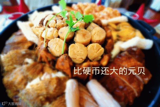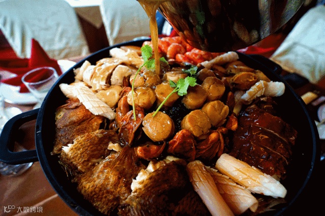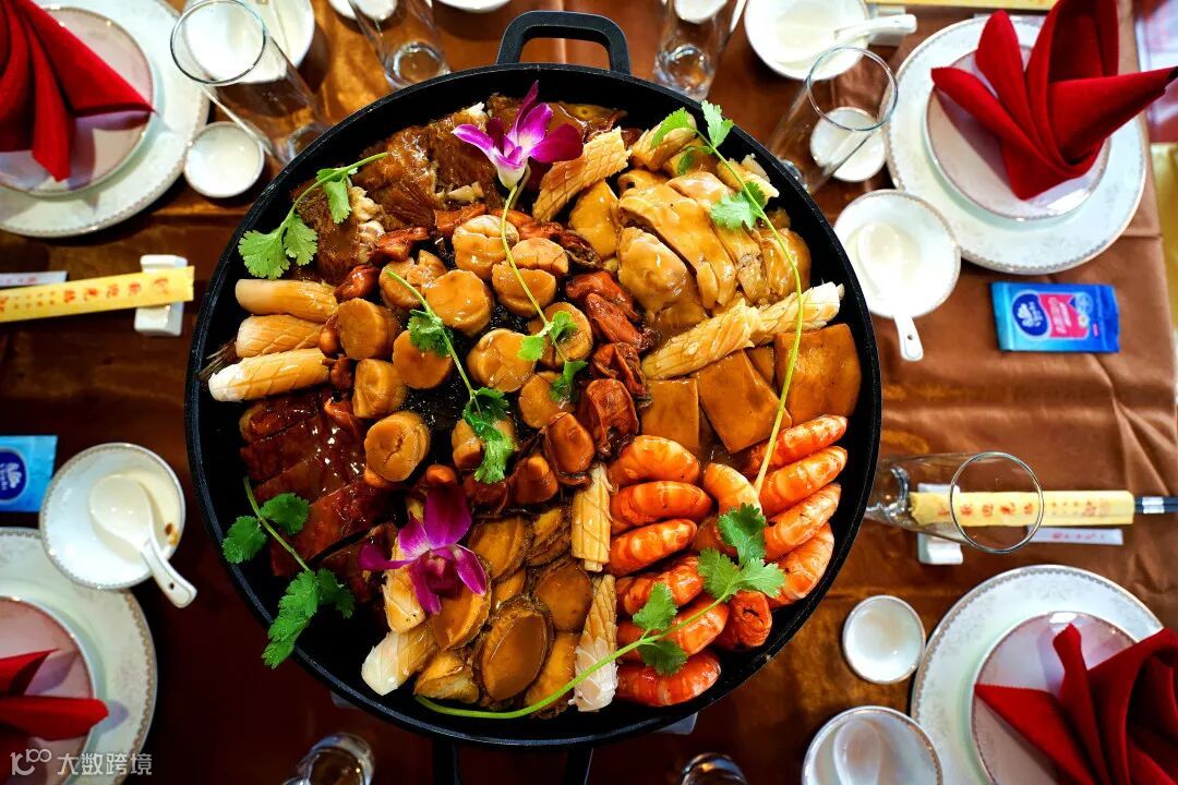 堆叠成小山状的盆菜寓意着“盘满钵满”