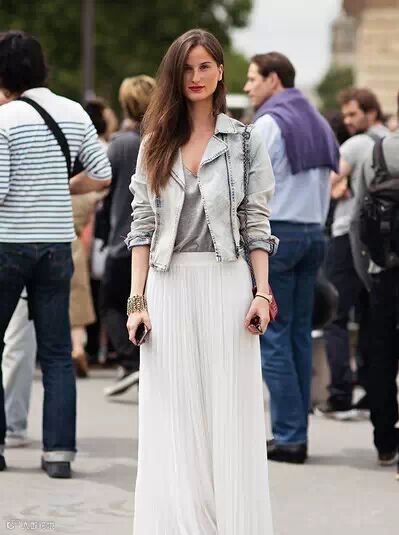 搭配要点:灰色V领打底衫+白色百褶长裙+磨白短款牛仔外套+红色链条包