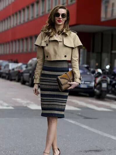 搭配要点:卡其色短外套+条纹包臀裙+裸色尖头高跟鞋+棕色手拿包