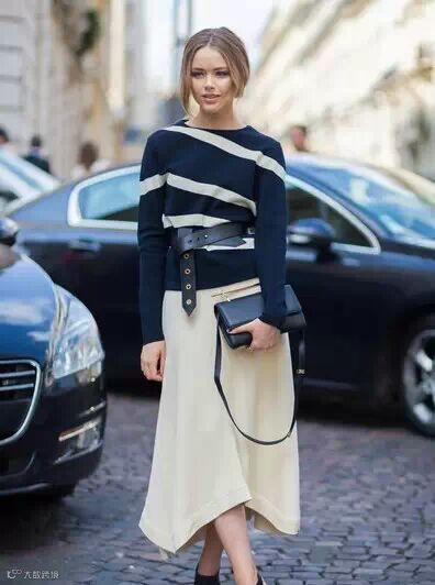 搭配要点:藏蓝色条纹针织衫+米色不规则长裙+黑色尖头高跟鞋+黑色腰带+黑色挎包