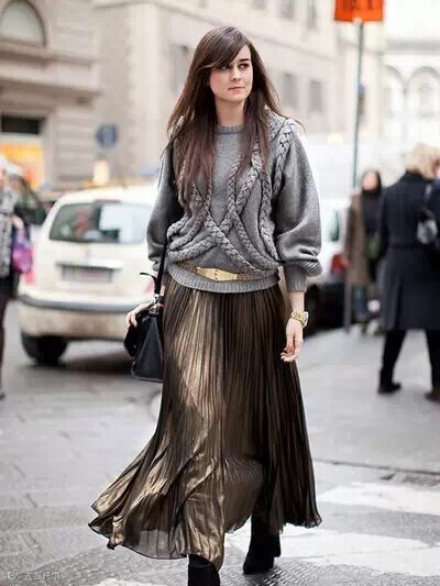 搭配要点:灰色蝙蝠袖套头毛衣+金色百褶裙+黑色短靴+金色宽腰带+黑色单肩包
