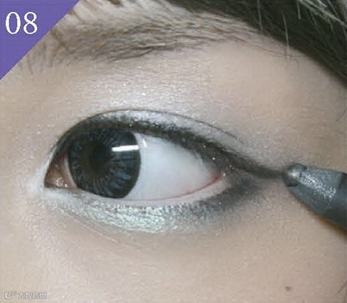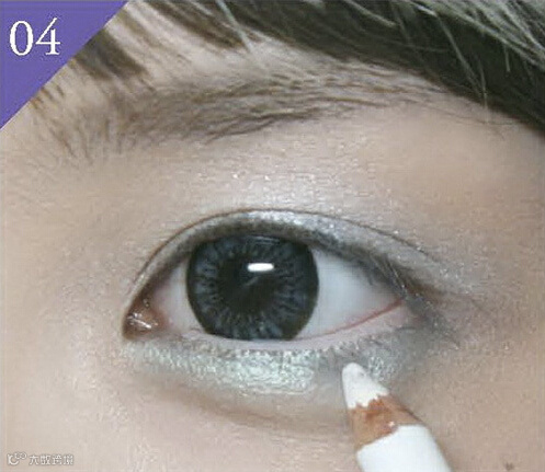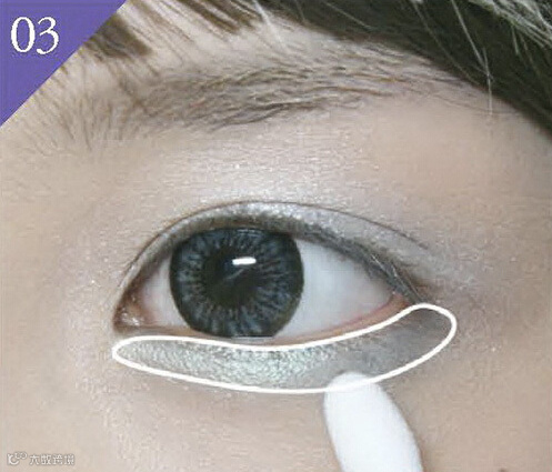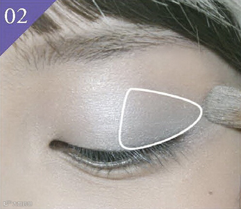 2. 将珠光银白色眼影在眼尾涂抹出有如扇子的形状,轻涂2~3次。