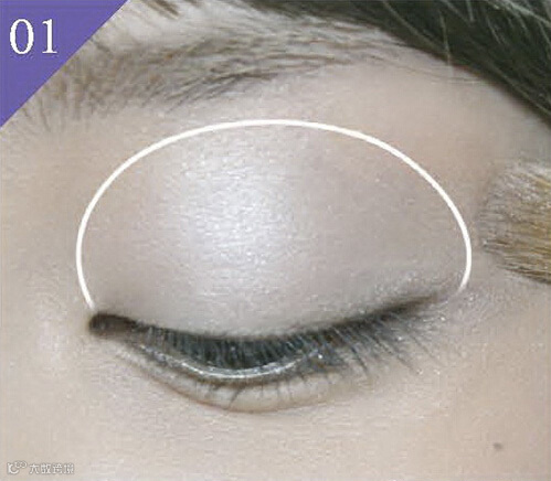 将珠光白色眼影涂抹在整个上眼皮,如图中所标示的位置。