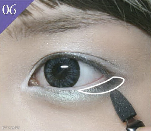 6. 用扁平的眼影棒沾取黑色眼影涂抹在眼尾尾端部分,如图中所标示的范围。不要涂得太深,轻轻涂抹1~2次就可以了。