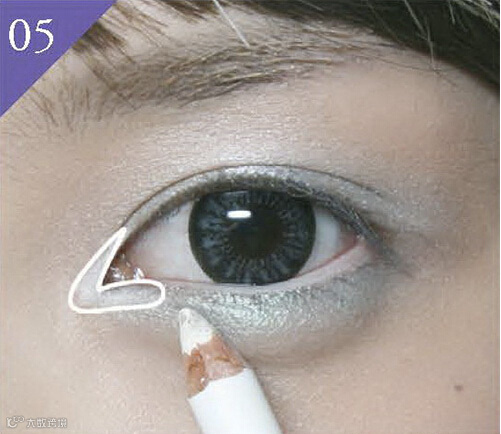 5. 将白色眼线笔涂抹在眼头部分,如图中所标示的范围。