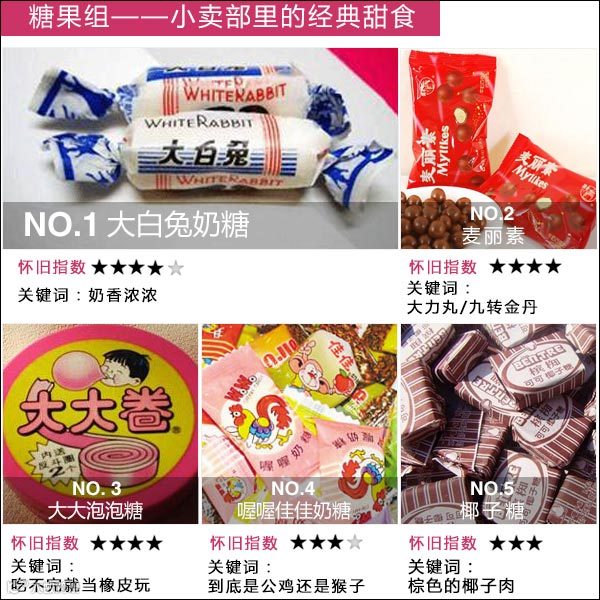 冠生园的大白兔奶糖太经典了。小时候对大白兔奶糖外面那层可以吃的“纸”最好奇,每次都舔得干干净净。它曾经的广告语可是“七颗大白兔奶糖等于一杯牛奶”,奶香味特别明显。现在,大白兔奶糖多了很多口味,巧克力、红豆、咖啡……但如果偶尔再吃一次大白兔,最爱的还是原味。