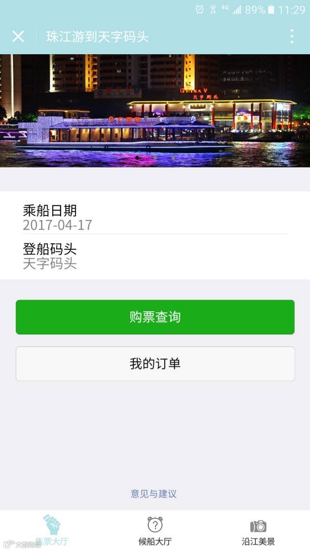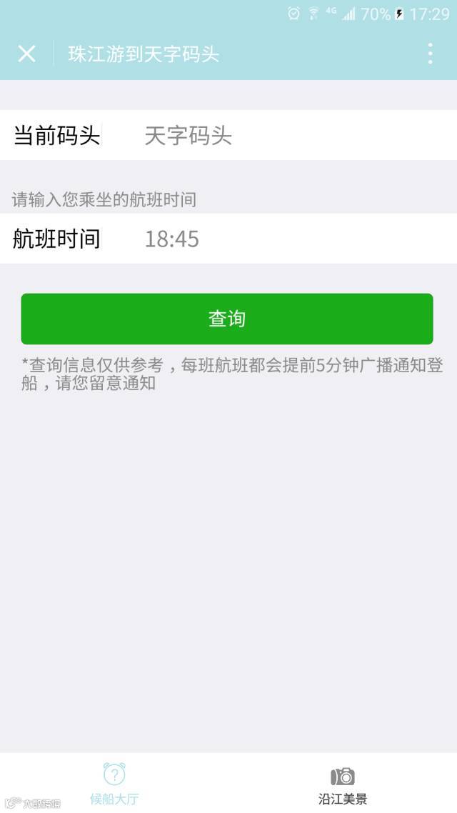 进入售票大厅选项,选择乘船日期和登船码头,点击购票查询。