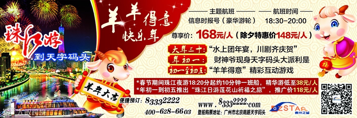 初一到初五,“羊羊得意”精彩互动游戏陪你过大年!更加推“珠江日游莲花山祈福之旅”,推广价118元/人,是春节登高祈福最佳选择!